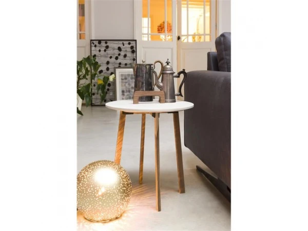 De eigentijdse lampenserie Chiara van het merk Coco Maison heeft een vleugje retro, dit komt vooral door de vormgeving van de lampenkap. Het licht fonkelt door de kleine gaatjes in de lampenkappen, wat voor een fraai sfeervol lichtspel zorgt. De serie bestaat uit een hanglamp, een tafellamp en een vloerlamp. Deze tafellamp is niet dimbaar. Verlichting met een E27 fitting passen in deze lamp. De vloerlamp staat op een mooie mat zwart metalen driepoot. De serie Chiara is verkrijgbaar in 2 kleuren (wit en goud).