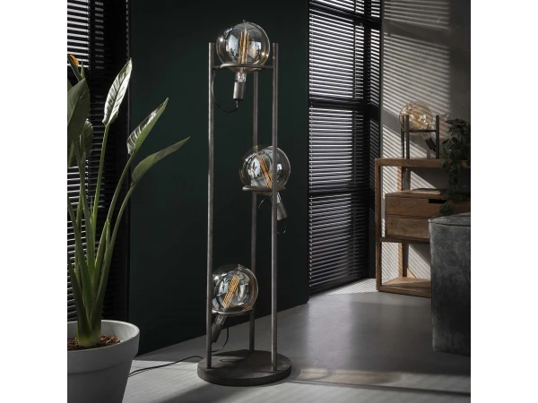 Deze ‘Saturn’ vloerlamp is speciaal ontwikkeld en geschikt voor drie LED lichtbronnen met een doorsnede van 200 mm. Deze industriële vloerlamp is afgewerkt in oud zilver wat de lamp een vintage uiterlijk geeft. De stroomkabels zitten in de buizen verwerkt. Er wordt aanbevolen een LED lichtbron met E27 fitting te gebruiken. Deze vloerlamp behoort tot een serie bestaande uit twee tafellampen, een hanglamp en twee vloerlampen.